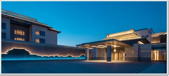 酒店落客區低調含蓄,充滿中國人文氣質。由主入口雨棚﹑金屬(詞條“金屬”由行業大百科提供)景墻和攬月亭三部分組成。鋁背板加金屬格柵(詞條“格柵”由行業大百科提供)系統的金屬景墻首先映入眼簾,以北京天際線為背景,迎接八方來客。夜晚亮燈時分,恰到好處的燈光烘托出金屬景墻的剪影效果,在靜謐的夜色中安靜佇立,仿佛一幅畫卷徐徐展開。