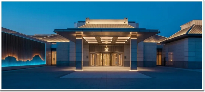 雨棚及主出入口形成強烈的現代建筑色彩,將整個酒店中式﹑奢華﹑典雅的建筑風格展現得淋漓盡致。