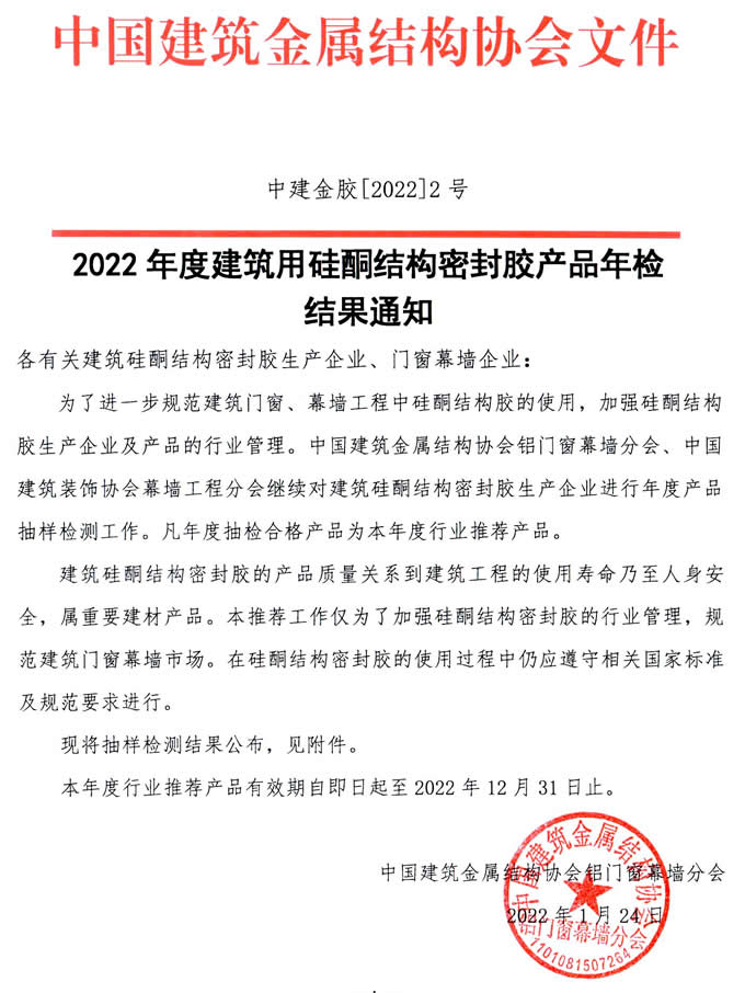 2022年度建筑用硅酮結(jié)構(gòu)密封膠產(chǎn)品年檢結(jié)果通知