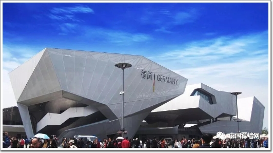 德國館同樣是由網狀的新穎建筑面料構成,起到很好的隔熱和遮陽的效果,材料本身非常柔和,在燈光的映襯下,顯出一種很朦朧的感覺,彰顯金屬的質感。