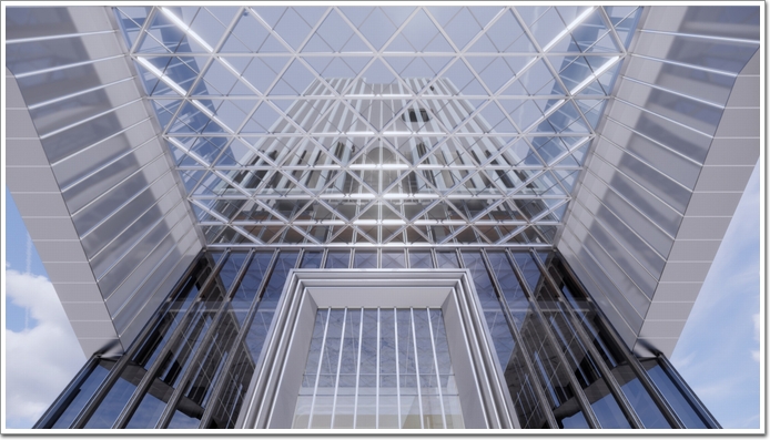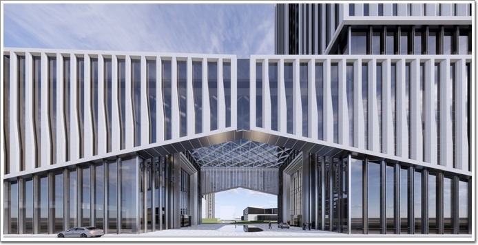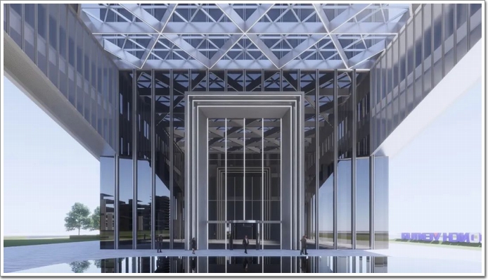 從城市角度看向海螺創業總部,充滿力量感的入口懸挑,打造震撼視覺效果的裸眼3D透明屏,鮮明地昭示著海螺創業的品牌形象。