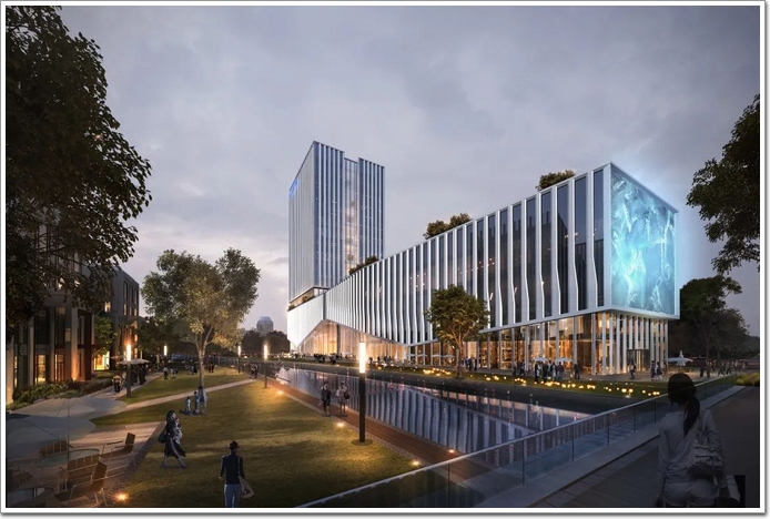 在園區西側地塊,以一個“超級智慧環”聚焦相關產業服務區,包含技術研發中心、人才培育中心、上市公司孵化中心,以及國際化運營平臺,彼此之間通過空中連廊相互連接。