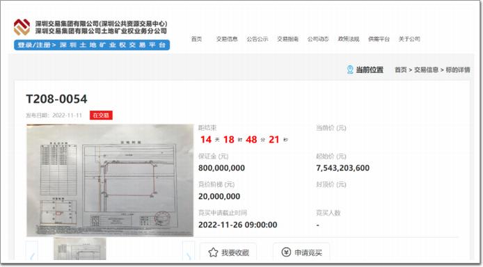 2022年11月11日,深圳公共資源交易中心上線了一則新的土地轉讓信息,受轉讓人委托以掛牌方式公開轉讓位于南山深灣片區的T208-0054宗地使用權、地上建筑物、附著物,該地塊為商業服務業用地,轉讓起始價約為75.4億元,競買保證金約為8億元。