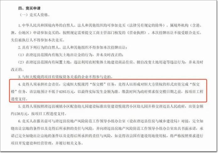 競得人須承擔社會責任,完成恒大悅瓏灣“保交樓”任務,競得人以形成對恒大方債權的形式出資完成“保交樓”任務,其中27010-202257號地塊預計不低于21136萬元,27010-202258號地塊預計不低于4285萬元,27010-202259號地塊預計不低于3142萬元,以最終實際發生金額為準。繳款時間為政府要求保交樓日期之前,按項目工程進度支付。