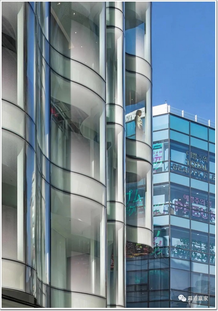 透光的玻璃材料捕捉不同時(shí)段、不同角度的光線,呈現(xiàn)出多變而多彩的外觀。起伏的曲線則賦予立面柔和而飄逸的觀感,在虛實(shí)之中營造獨(dú)特的空間氛圍