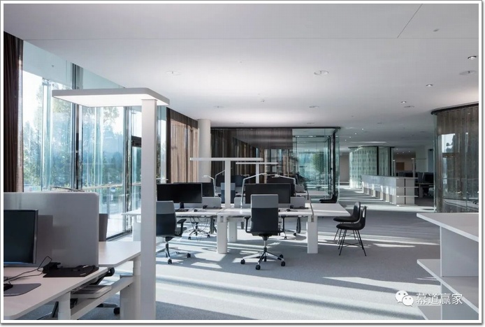 這座光線充足的建筑的六層樓毫不費(fèi)力地與蘇黎世湖下游盆地突出的湖濱融為一體。起伏的玻璃與湖水的波浪相協(xié)調(diào),而其柔和的線條和相關(guān)的光影效果打破了材料的剛性表面。