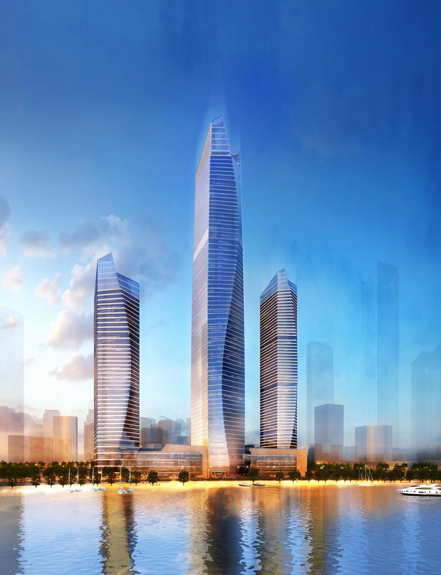 海天中心三棟塔樓的幕墻均為單元式幕墻,其中T2塔樓的幕墻造型為國內首創,是青島市的地標性建筑,是集多種業態于一體的超高端城市綜合體。