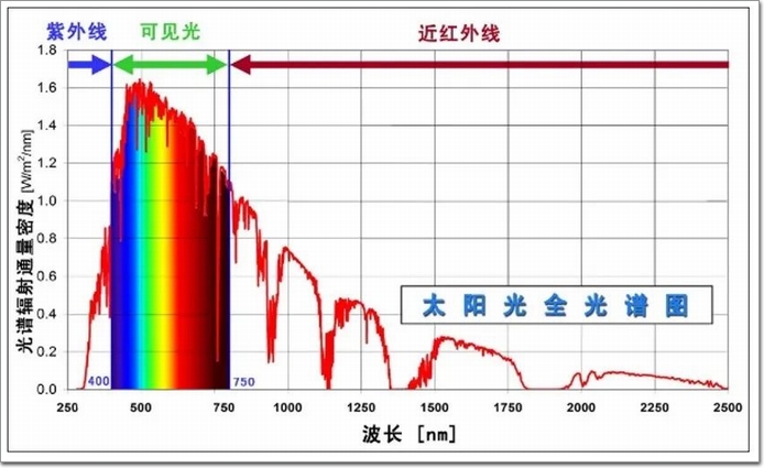 事實上,太陽光能量即太陽輻射(詞條“太陽輻射”由行業大百科提供)能,但不同于太陽輻射熱能。太陽光能中的熱能絕大多數是波長大于780 nm的紅外輻射熱能。380 nm波長內紫外線不直接產生熱量,380~780nm波長的可見光能只有極少量能夠轉變為人體可感知的“熱能”,相關研究給出的可見光能量轉化為熱能的比例約5%,最多不超過10%,也就是說多達47%的可見光能基本不產生熱能,不需要制冷消耗,而遮陽系數Sc包含了太多“非熱量”。
