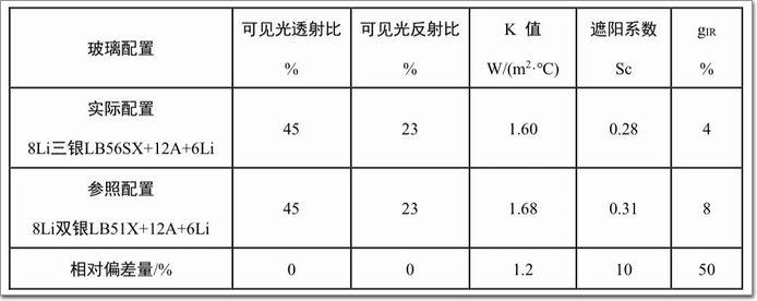 從表5中可以看出,遮陽系數Sc接近(偏差不到10%),而太陽紅外熱能總透射比gIR相差50%。由此可以推斷,以遮陽系數Sc來核定,雙銀比三銀Low-E的建筑能耗高10%左右,而若以太陽紅外熱能總透射比gIR來核定,雙銀將比三銀Low-E的建筑能耗高50%左右。