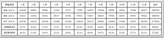 中機國際項目為中國南玻集團在湖南地區的第一個批量三銀Low-E項目,地處湖南省長沙市韶山中路18號,由中機國際工程設計研究院有限公司設計,于2016年竣工。整個項目由A、B兩棟百米塔樓組成,塔樓中間由裙樓連接,超白三銀Low-E中空玻璃用量3.5萬m2,其中A棟超白三銀Low-E中空玻璃用量8259 m2,逐月跟蹤記錄了A棟辦公區域用電量及變電器負載,據此對全年電耗負荷進行分析。中機國際大廈A棟辦公區域空調電耗模擬計算見表6。