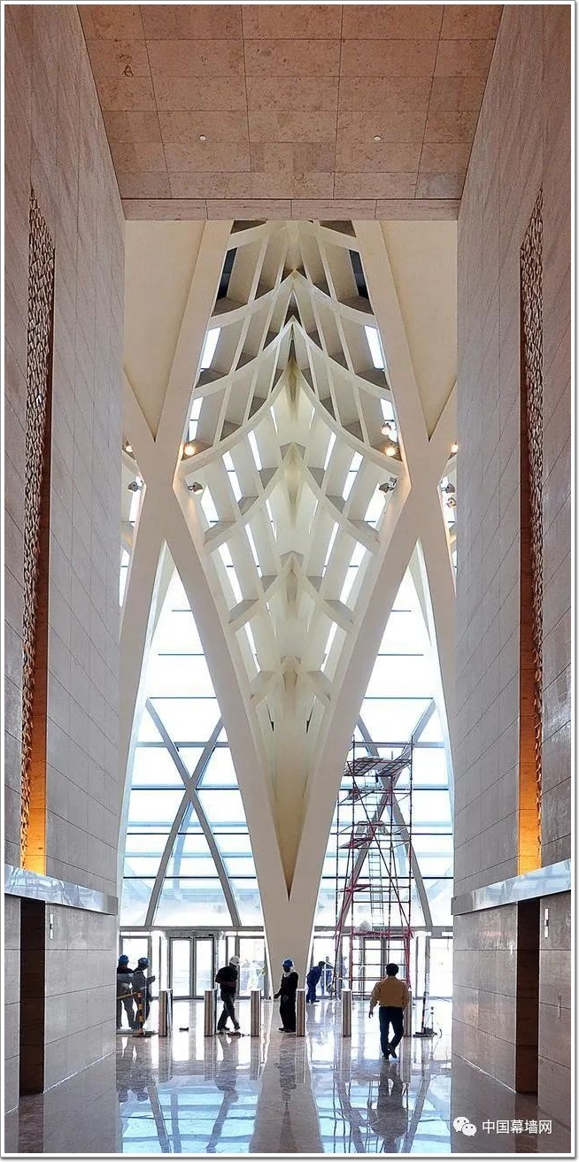 這“面”幕墻不僅可以保護建筑物免受惡劣環境的影響,而且還可以充當建筑物的結構脊柱, 這與塔身內向面的玻璃幕墻之間,形成色彩、造型、材質肌理上迥然不同的對比——一面海洋,一面沙漠,正如科威特國所呈現的中東地貌。