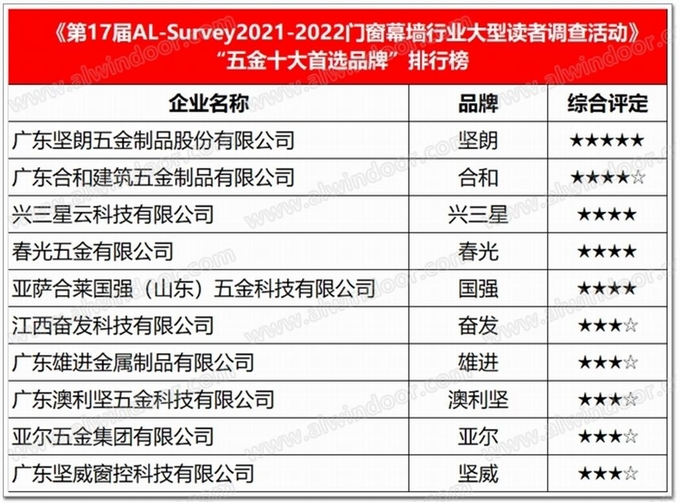 以上“TOP10”高端建筑五金品牌,由中國幕墻網ALwindoor.com根據“2021-2022年度AL-Survey五金十大首選品牌榜單”為基礎,輔以數字化、系統化架構,充分運用中國建筑金屬結構協會鋁門窗幕墻分會“數據統計報告”,進行市場調研、分析整理之后發布。