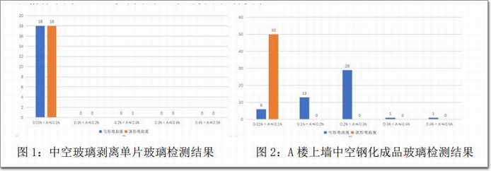 現場共抽取了 18 塊玻璃送試驗室做單片鋼化玻璃的彎曲度試驗,玻璃配置均為 6mm+12Ar+6mm+12Ar+6mm;測試顯示所有檢測的玻璃均合格,其中弓形彎曲度值檢測出的數據水平為:0.01%-0.05%,合格標準為 0.3%;波形彎曲度值檢測出的數據水平為:0.01%-0.05%,合格標準為 0.2%,檢測結果顯示遠優于國標要求。