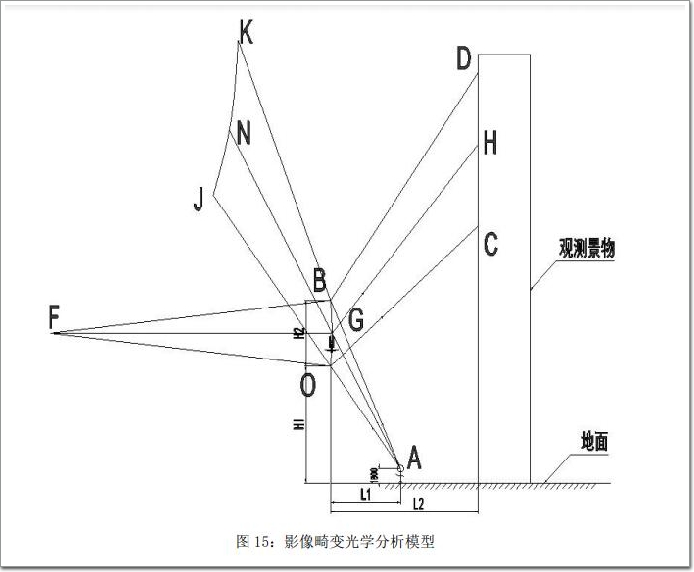 圖15 中OB 為凸面鏡,F 點為凸面鏡的曲率圓心,鏡面高度H2,曲面拱高 H,鏡面底部距地高度H1,A 點為人眼觀測點,人眼觀測點距離地面1.8 米,距鏡面垂直距離L1,CHD 為被觀察建筑物,建筑物與鏡面垂直距離為L2,圖中 C、H、D 三點在凸面鏡中成像點為 K、N、 J,光學分析可見直線CHD 成像后變為曲線KNJ。但這個曲線變化并非影像畸變的原因,真正的原因是DC 到KJ 成像后的伸縮。