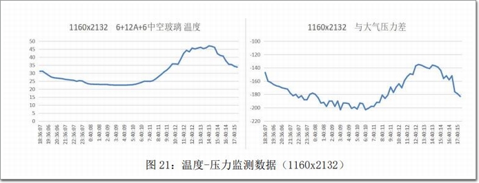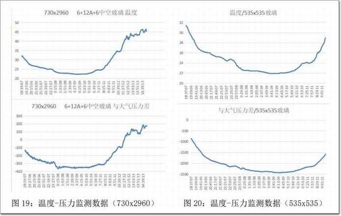 氣溫的變化會引起中空玻璃內壓的變化,從而造成玻璃的凸凹變形,進而影響玻璃影像畸變。根據理想氣體方程:PV=nRT,在體積不變的情況下,溫度變化會引起內壓的顯著變化,溫度升高 30 度,內壓增加約10 kPa,已遠遠超出一般玻璃幕墻設計風荷載。但實際上,溫度上升,氣壓增加的同時,玻璃會發生變形而減小壓力,實際增加的壓力會比較小,筆者通過大量的試驗監測,得出的監測的數據顯示這一分析,圖19-圖21 給出了四種不同規格的玻璃的溫度和內部壓力的試驗監測數據。