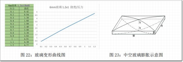 通過壓力撓度計算,可見壓力與撓度近似線性關系(如圖22),為了方便分析簡化計算,建立壓力/撓度變化的線性方程: P=k*h+b (式中P 為壓力,h 為撓度,k、b 為系數)不同規格的玻璃可回歸出不同的 k、b 系數,在溫變撓度變化范圍內,本方程誤差小于 1%。