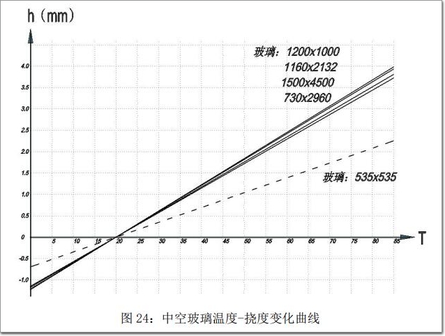 通過上面方程的計算,我們得出 1200x1000、1160x2132、1500x4500、730x2960 和 535x535 等五種玻璃的溫度/撓度變化曲線(如圖24)。對于較大規格的玻璃,通過此方程得出的某溫度變化區間下的撓度與試驗監測的中空玻璃內壓計算的撓度較為一致,對于較小規格如 535x535 的中空玻璃,溫度變化下內壓增加較多,撓度變化的抵消作用顯著減小,結構膠的變形需加以考慮,提示在極端情況下玻璃和結構膠的驗算需要考慮內壓的作用。通過溫度/撓度方程的計算,邊長超過 700mm 的玻璃,溫度從 20 度升高到 50 度時,溫度效應導致的撓度變形小于 2mm,即便是如此小的變形,通過畸變率方程計算顯示,畸變率也在 30%左右(如圖14),影像會發生顯著的變化。
