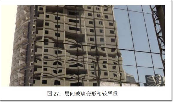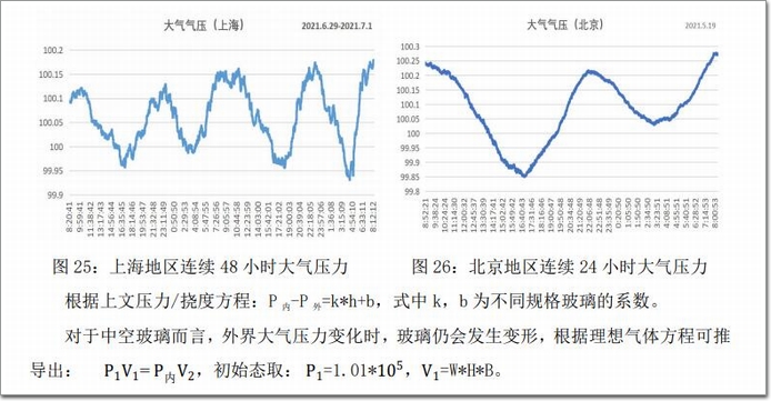 (1) 環境溫度:通過玻璃影像畸變第二方程(溫度/撓度方程),可以很方便的知道對于邊長大于 700mm 的 6+12A+6 中空玻璃,溫度增加 30 度,變形不大于 2mm,玻璃尺寸對變形影響不大,同樣是 2mm 變形,更大的玻璃曲率更小,這提示較大的玻璃在溫度變化下影像畸變更小。這就是為什么層間玻璃的影像畸變更為嚴重,如圖 27。