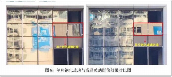 從以上數據分布可以看出:中空鋼化成品玻璃的弓形數值要遠遠大于同一塊玻璃剝離出來的單片鋼化玻璃的弓形數值,兩者完全不在一個數量級上,成品玻璃的弓形數值為單片玻璃數值的 10 倍到 20 倍之間,甚至能夠達到 30-40 倍。為進一步印證此項是否為主要原因,我們將剝離出來的單片鋼化玻璃重新拉回安裝,進行影像效果對比發現單片玻璃的影像效果遠遠好于成品玻璃,可見成品鋼化中空玻璃的弓形變形會造成反射圖影像的嚴重畸變,詳見下圖8: