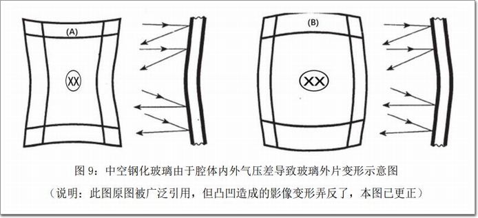 通過以上數據及相應影像對比,可以看到:造成現場玻璃反射影像嚴重變形的主要原因是中空腔體內外氣壓差致使外片玻璃的弓形彎曲度增大(外凸或者內凹)。中空玻璃是一個密閉的系統,內部壓力變化時,壓力將會作用于玻璃表面,就會引起玻璃的膨脹或收縮變形;當氣壓發生變化時,若中空玻璃腔體內氣壓低于外部大氣壓,中空玻璃就會出現收縮變形;若中空玻璃腔體內氣壓高于外部大氣壓,中空玻璃就會出現膨脹變形,導致現場玻璃形成了所謂凹凸鏡式的“哈哈鏡”現象。如圖9 所示。根據理想氣體方程:pV=nRT,當溫度變化時,中空玻璃內部體積及壓強都會變化,然而內壓的變化不僅僅只是溫度引起的,后文將進一步說明。