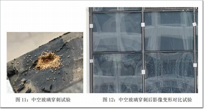 本試驗需要從中空層接一導氣管,試驗時氣溫較高,當鉆開中空玻璃密封膠和間隔條(詞條“隔條”由行業大百科提供)時,分子篩噴涌而出(如圖11),顯示出中空玻璃空氣層存在較大內壓。下圖右上角玻璃已放氣,其余三塊未放氣,放氣后影像畸變得到顯著改善(如圖12)。