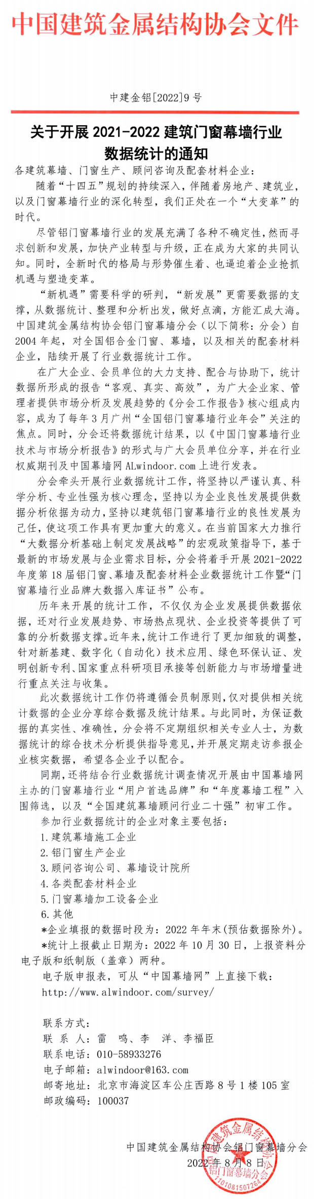 “新機遇”需要科學的研判,“新發展”更需要數據的支撐,從數據統計、整理和分析出發,做好點滴,方能匯成大海。中國建筑金屬結構協會鋁門窗幕墻分會(以下簡稱:分會)自2004年起,對全國鋁合金門窗、幕墻,以及相關的配套材料企業,陸續開展了行業數據統計工作。