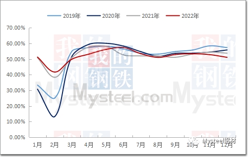 2019-2022年中國(guó)鋁型材樣本企業(yè)開(kāi)工率