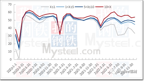 分企業(yè)產(chǎn)能規(guī)模來(lái)看,12月份產(chǎn)能X<1萬(wàn)噸的鋁型材生產(chǎn)企業(yè)開(kāi)工率僅為33.04%,環(huán)比下跌5.12%;產(chǎn)能1≤X<5的鋁型材企業(yè)開(kāi)工率為44.34%,環(huán)比下跌2.71%;產(chǎn)能5≤X<10的鋁型材企業(yè)開(kāi)工率為47.88%,環(huán)比下跌1.52%,而產(chǎn)能X≥10萬(wàn)噸的鋁型材企業(yè)受淡季影響較小,多家鋁型材龍頭企業(yè)生產(chǎn)線(xiàn)沒(méi)能開(kāi)滿(mǎn),產(chǎn)能閑置率較高,綜合開(kāi)工率為53.65%,開(kāi)工率亦處于較低水平。