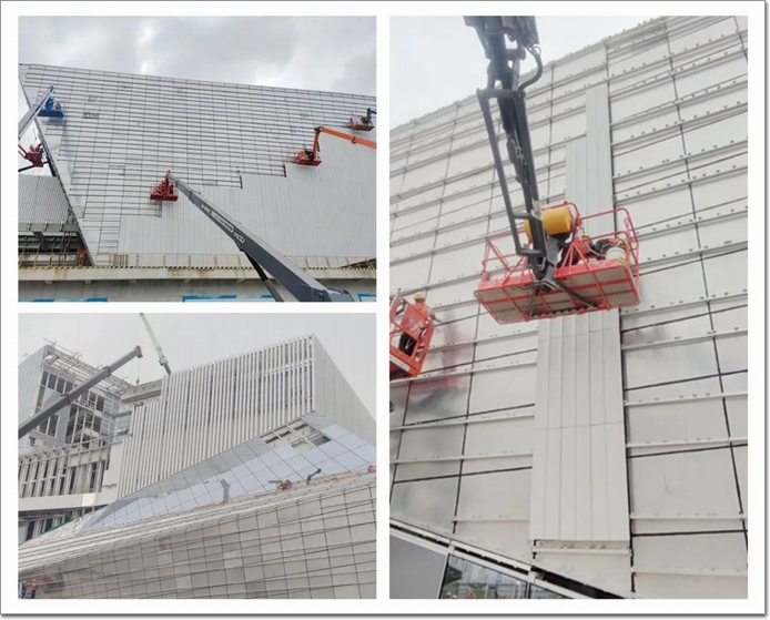尤其是大立面的超大雙曲變形的幕墻,共用了4600多塊冰裂紋釉面陶板,安裝難度非常大,通過構造設計與工藝改造,在地面組裝與整體吊裝,確保安裝中能夠一次成形并達到更好的幕墻應用效果。