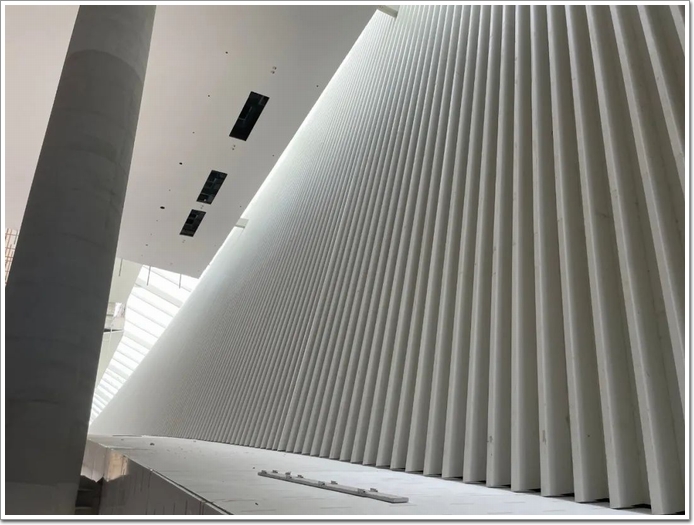 其中,建筑主立面是由:玻璃+白色冰裂紋陶瓷格柵雙層幕墻系統,以及白色冰裂紋陶瓷面板幕墻系統,再加上清水混凝土表面防護等組成。