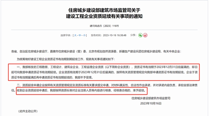 還有就是,住建部資質(zhì)延續(xù)通知發(fā)布了這么久居然有很多企業(yè)還不知道延續(xù)的事情,還有很多企業(yè)說(shuō)等省廳通知,難道住建部的通知寫得還不明確嗎,由住建部負(fù)責(zé)審批的資質(zhì)必須延期,由地方主管部門(詞條“門”由行業(yè)大百科提供)審批的請(qǐng)看各省廳的延續(xù)通知要求。