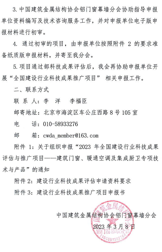 我會和住房和城鄉建設部科技與產業化發展中心聯合組織開展2023年全國建設行業科技成果評估與推廣項目——鋁門窗(詞條“門窗”由行業大百科提供)幕墻專項技術與產品申報工作。現將住房和城鄉建設部科技與產業化發展中心《關于組織申報“2023年全國建設行業科技成果評估與推廣項目——建筑門窗、暖通空調及集成廚衛專項技術與產品”的通知》(建科中心函[2023]38號)轉發給你們,并將相關補充事項通知如下: