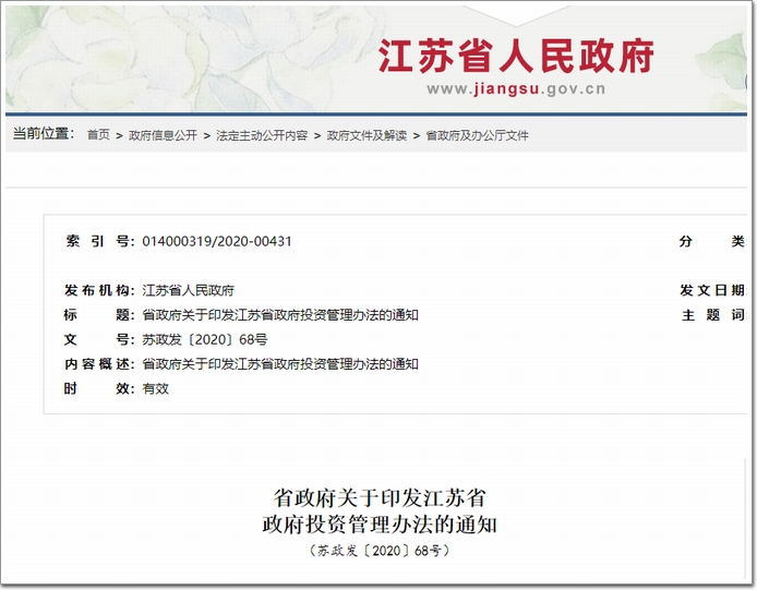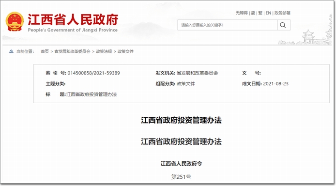 江西省政府印發(fā)《江西省政府投資管理辦法》,自2021年10月1日起施行。