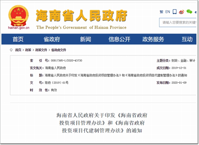 查看全文:海南省人民政府關(guān)于印發(fā)《海南省政府投資項目管理辦法》和《海南省政府投資項目代建制管理辦法》的通知(瓊府〔2019〕61號)