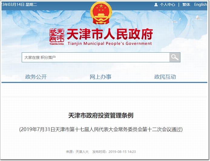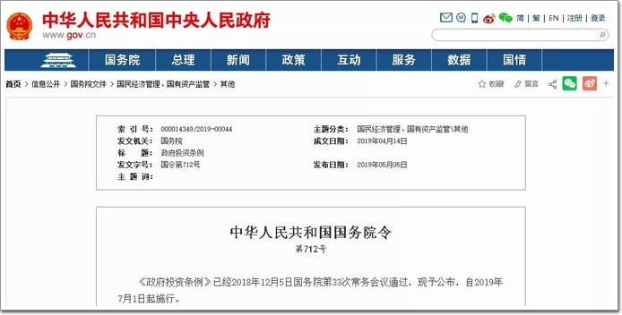 《政府投資條例》已經(jīng)2018年12月5日國務(wù)院第33次常務(wù)會議通過,現(xiàn)予公布,自2019年7月1日起施行。