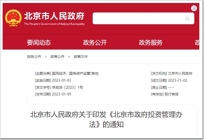 2023年1月2日,北京市人民政府印發(fā)《北京市政府投資管理辦法》(京政發(fā)〔2023〕1號),自印發(fā)之日起施行。