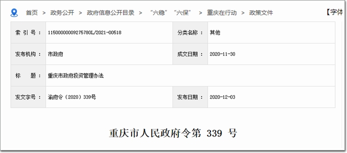 查看全文:《重慶市政府投資管理辦法》重慶市人民政府令第 339 號