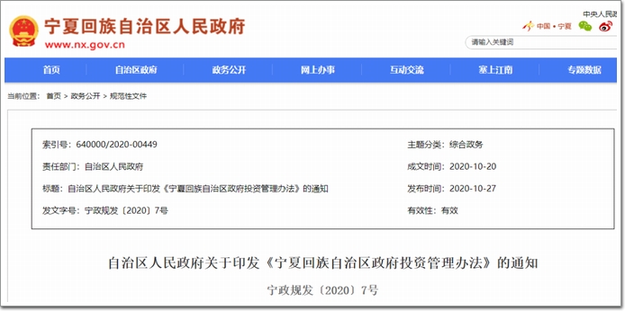2020年10月20日,寧夏印發(fā)《寧夏回族自治區(qū)政府投資管理辦法》,自2020年12月1日起施行。