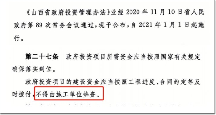 該《條例》專門規(guī)范政府投資行為,是我國政府投資領(lǐng)域第一部行政法規(guī)。第22條明確規(guī)定:“政府投資項目不得由施工單位墊資建設(shè)!庇蓢鴦(wù)院出臺行政法規(guī),明確政府工程禁止“施工單位墊資”,其效力不是部委的通知可比的。