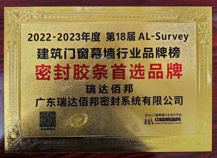 廣東瑞達佰邦密封系統有限公司憑借憑借多年穩健經營、卓越的產品呈現、領先的創新能力,完善的服務體系以及良好的市場口碑,最終贏得了廣大行業領導專家等評委會成員的高度認可,在第18屆AL-Survey2022-2023中國門窗幕墻行業大型讀者調查評選活動中,蟬聯 “密封膠條首選品牌”大獎!