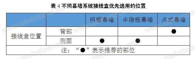 光伏構(gòu)造設(shè)計(jì)對(duì)于光伏幕墻產(chǎn)品的落地起著至關(guān)重要的作用。光伏組件背后設(shè)置接線盒,幕墻構(gòu)件的組裝需避開接線盒,避免干涉。太陽(yáng)能電池組件主要作用是將太陽(yáng)能電池產(chǎn)生的電力與外部線路連接。接線盒根據(jù)放置位置的不同分為背部接線盒和側(cè)邊接線盒。背部接線盒位于光伏幕墻組件背面端部或中部,側(cè)邊接線盒位于光伏幕墻組件前后或左右端部玻璃切割面。不同廠家設(shè)置的接線盒尺寸不一,不同幕墻系統(tǒng)接線盒優(yōu)先選用的位置不同,見表4。
