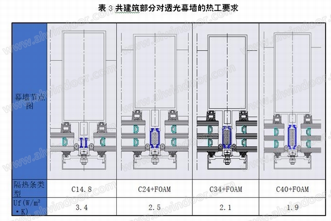 透光幕墻的傳熱系數(shù)的要求Uf≤2.0,使用常用材料組裝光伏玻璃幕墻的配置至少為C40隔熱條,三玻兩腔的玻璃配置,見表3。