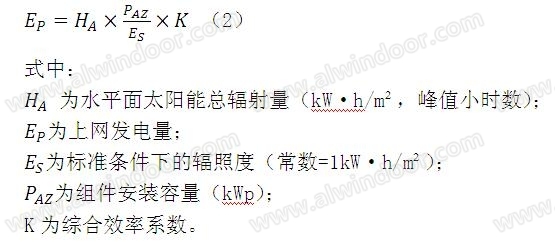發(fā)電量的計(jì)算是建筑開發(fā)單位和設(shè)計(jì)單位很重視的參數(shù),因?yàn)榻ㄖ凸夥慕Y(jié)合根本目的是發(fā)電,發(fā)電越多,能夠節(jié)省更多的能源,減少更多的碳排放。在建筑設(shè)計(jì)的前期方案階段,發(fā)電量可以粗估計(jì)算,光伏幕墻具體設(shè)計(jì)階段,要詳細(xì)準(zhǔn)確計(jì)算系統(tǒng)的發(fā)電量。發(fā)電量計(jì)算的公式通常采用《光伏發(fā)電站設(shè)計(jì)規(guī)范》GB50797-2012,發(fā)電量計(jì)算章節(jié)中提供的公式: