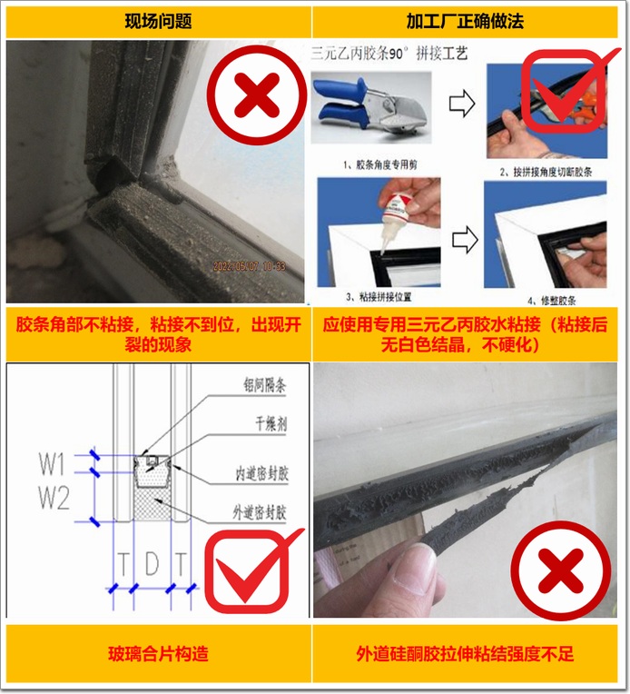 膠條角部或大面接口處粘接可靠(手指按壓不開裂、無透光縫隙)、合頁部位膠條配合緊密無空隙、且啟閉不干 涉;角部膠條不能硬化(詞條“硬化”由行業(yè)大百科提供)。