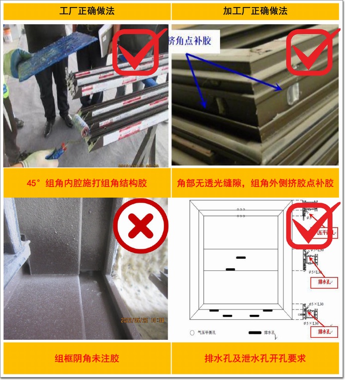使用螺釘組框時,組框下陰角必須注膠密實飽滿;
