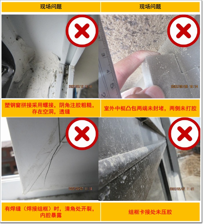 鋁窗型材、塑鋼螺接陰角注膠,室外中挺凸包兩端封堵及兩側(cè)打膠防滲。