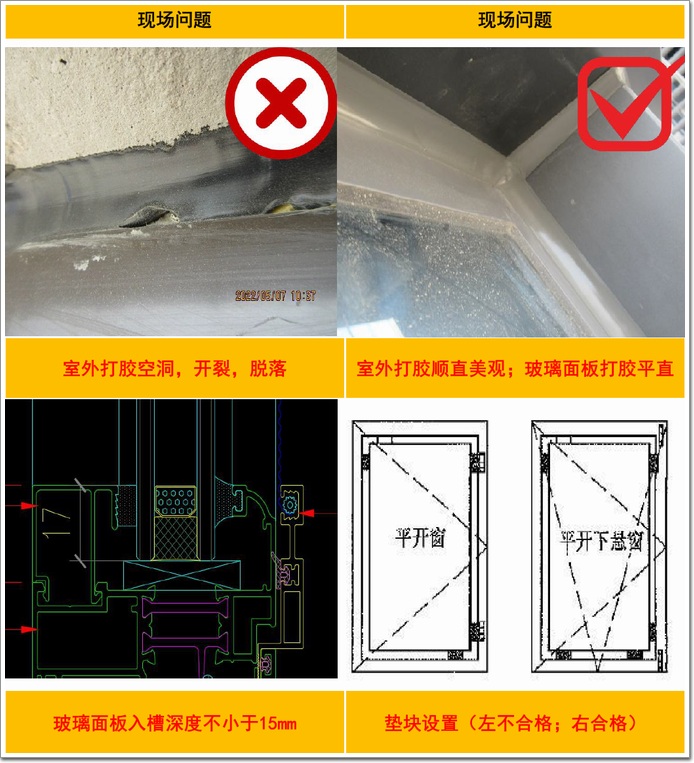 框扇45°組角拼接面涂抹斷面(詞條“斷面”由行業(yè)大百科提供)密封膠,角部無透光縫;擠膠點補膠封堵。