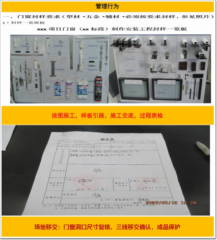 進場前封樣(主材,輔材,五金,玻璃),封樣要求納入門窗工程標前交底文件,貨量區(qū)施工進場前必須完成封樣。