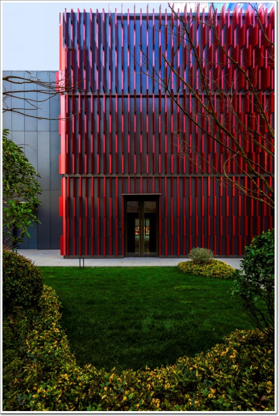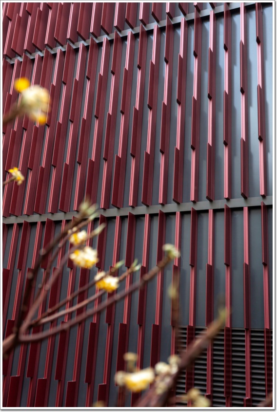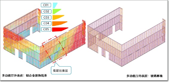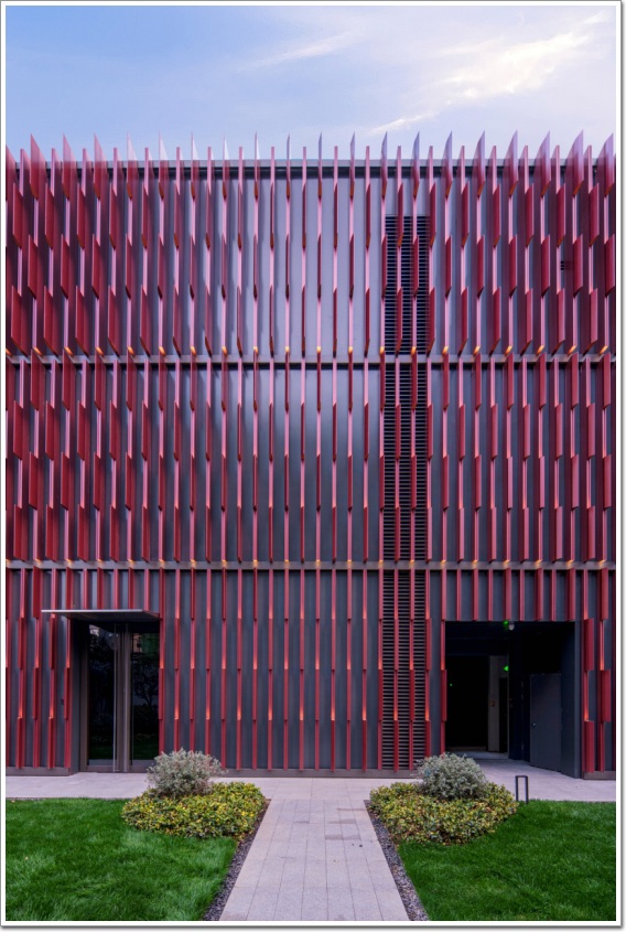 實現(xiàn)方式上,采用鋁型材制成的簡單系統(tǒng)來打造一個動態(tài)的馬賽克效果,外立面鋁肋組件由帶有3個矩形擠壓件和5個漸變裝飾肋的零件套組成。外墻的底部使用淺肋,頂部使用深肋,產(chǎn)生類似于樹冠的效果。