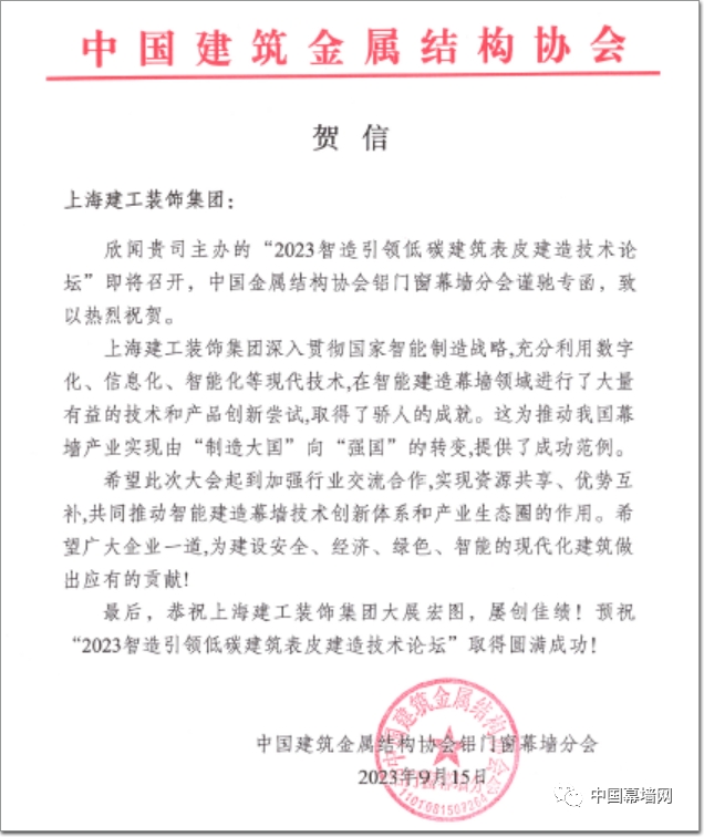 本次論壇的舉辦,還得到了“中國建筑金屬結(jié)構(gòu)協(xié)會鋁(詞條“鋁”由行業(yè)大百科提供)門窗幕墻分會”的大力支持,分分會長李福臣特此發(fā)來賀信,送上行業(yè)協(xié)會的期望與祝愿!